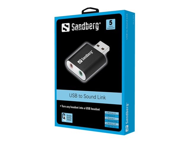 Specifikation Produktbeskrivning Sandberg USB to Sound Link ljudkort - USB Typ av enhet Ljudkort Modell Extern Typ av gränssnitt USB Lokalisering Danska, engelska, norska, finska, svenska Ljudutgångsläge Stereo Systemkrav Microsoft Windows 98, Microsoft Windows 2000, Microsoft Windows Millennium Edition, Microsoft Windows XP - Utökad specifikation