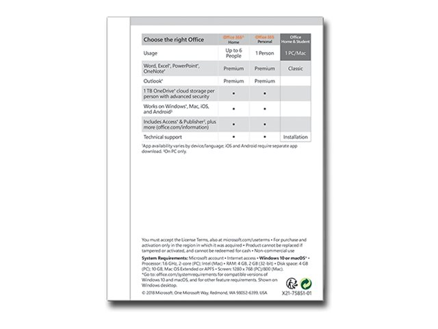 Specifikation Produktbeskrivning Microsoft Office Home and Student 2019 - boxpaket - 1 PC/Mac Typ av produkt Boxpaket Kategori Kontorsprogram - officesvit Antal licenser 1 PC/Mac Licensuppgifter Medielös, P6 Plattform Windows, MacOS Komponenter i programsvit Microsoft Excel, Microsoft Powerpoint, Microsoft Word Språk Engelska Lokalisering Eurozon -